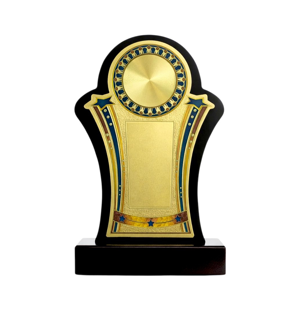 We can print your matter (Logo/Text) on a Golden/Silver Sheet and attach it to the base or center.