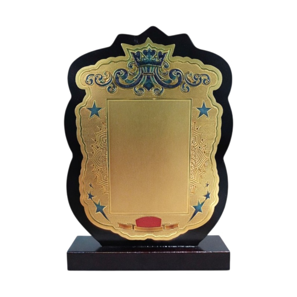We can print your matter (Logo/Text) on a Golden/Silver Sheet and attach it to the base or center.